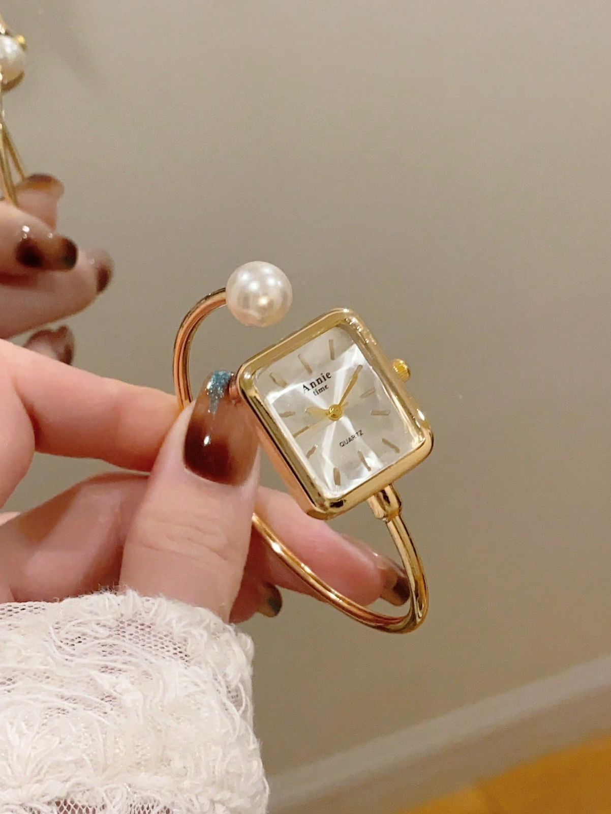 إسورة/ساعة تصميم مميز بإطار دهبي ومينا بيضا مع لؤلؤة جانبية، شيك ومختلف