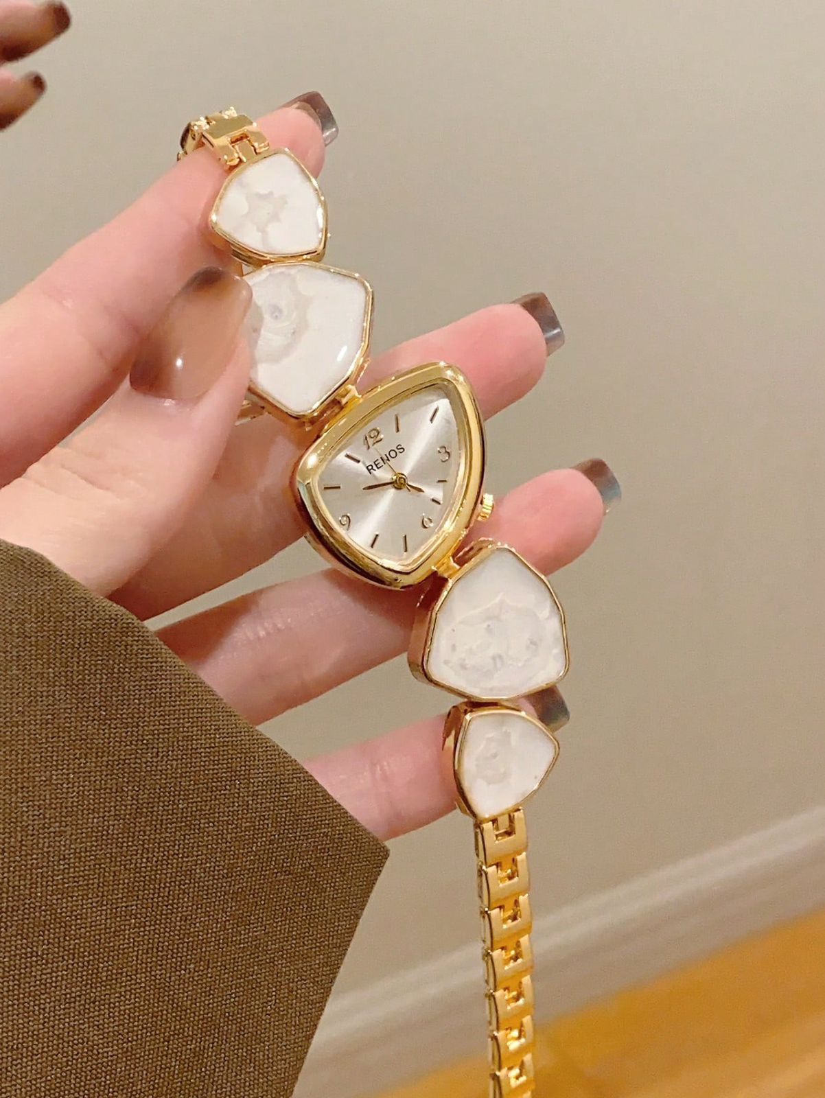 ساعة دهبي بسوار مزين بفصوص بيضا، فخمة وتليق على المناسبات
