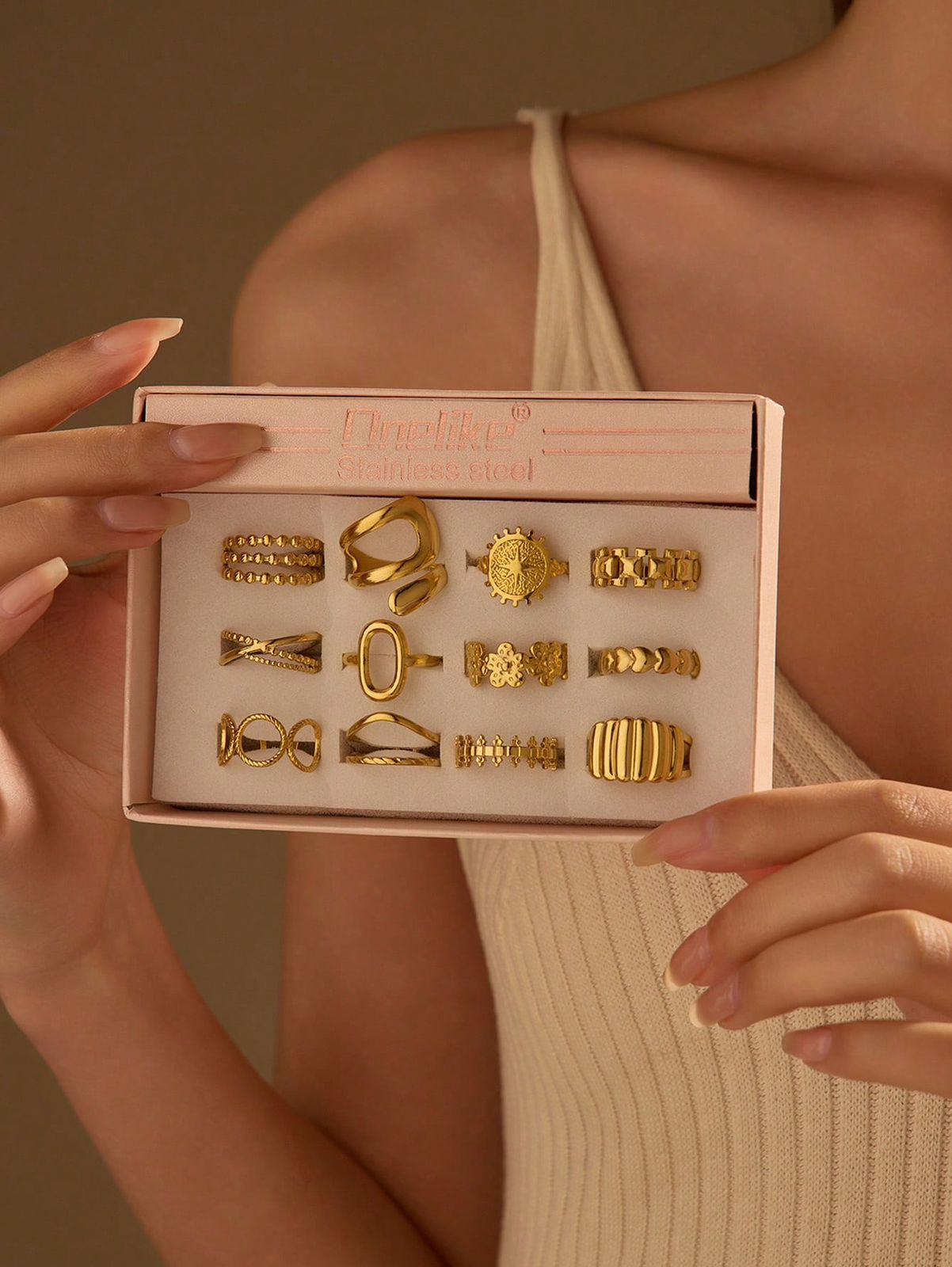 Onelike 12 قطعة / طقم خواتم من الصلب المقاوم للصدأ باللون الذهبي قابلة للتعديل، مناسبة كزينة أو كهدية للنساء ، مع علبة هدايا وردية