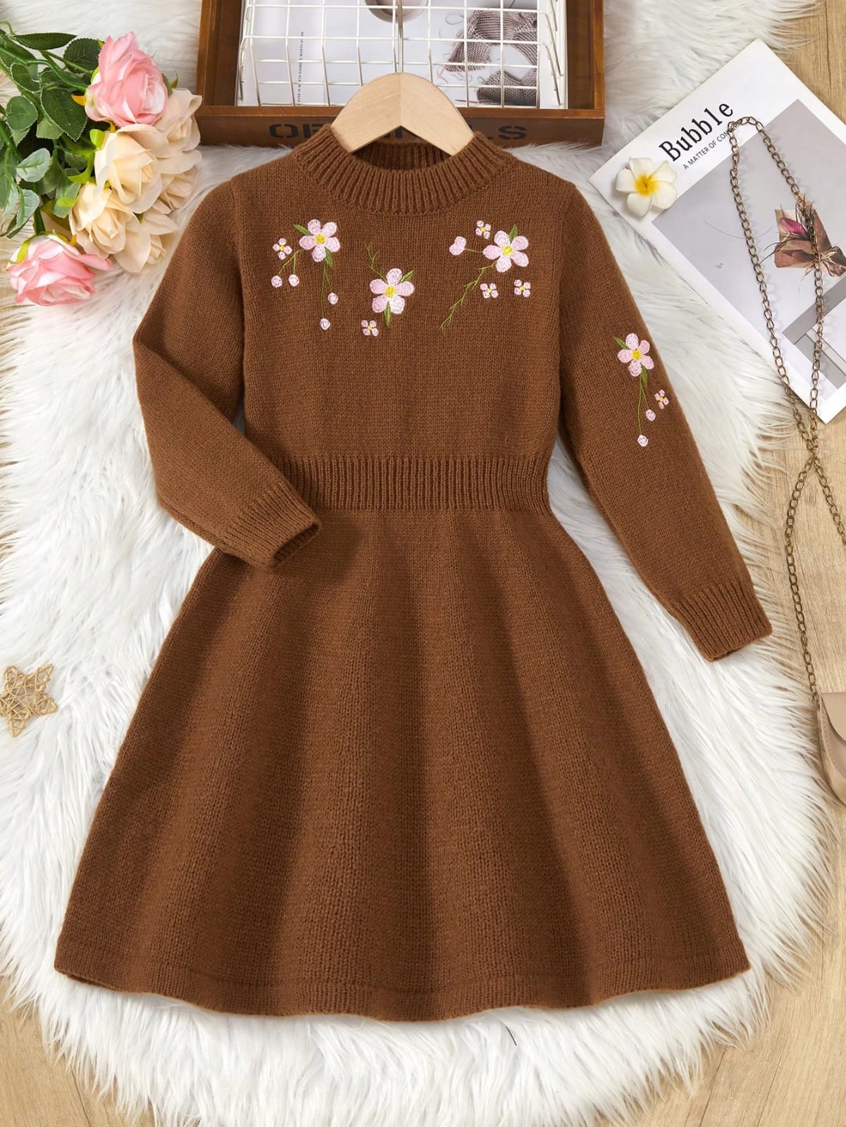 فستان كنزة مضفر جديد عصري بياقة عالية وخصر مطرز وأكمام مطرزة
